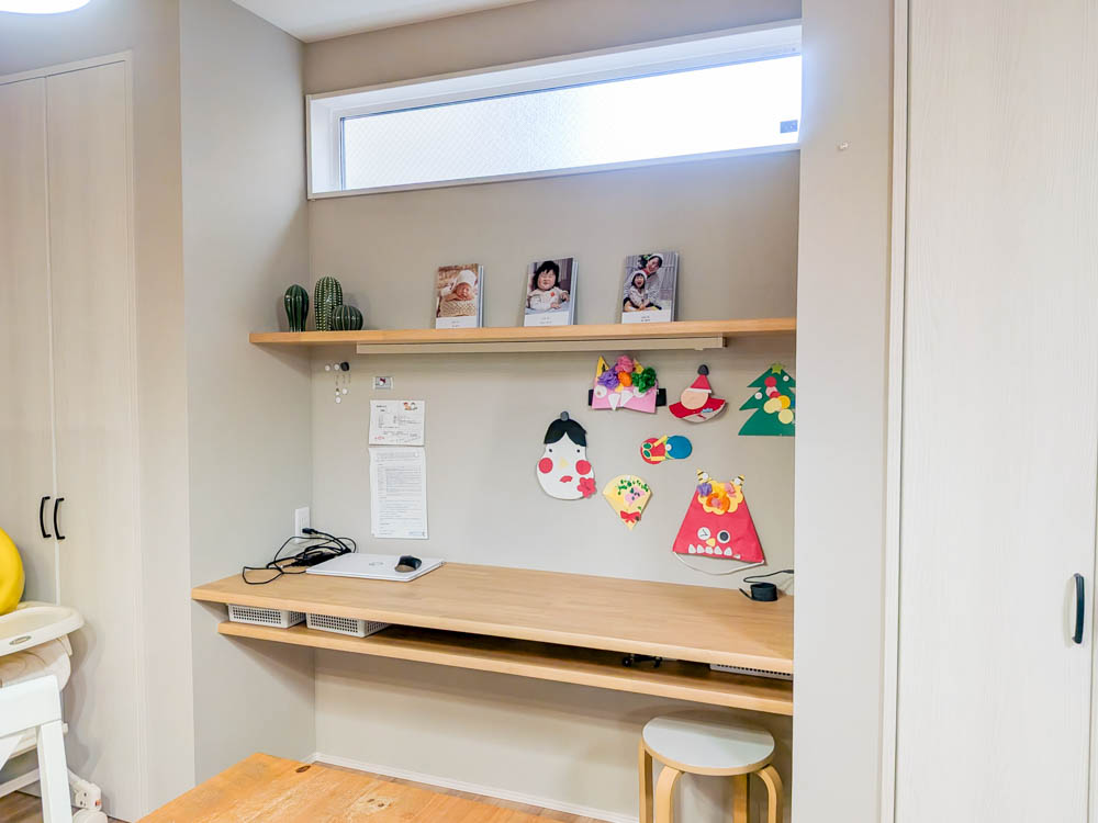2段にしてもらったのでちょうど細かいものも収納できるし、マグネットがくっつく壁がすごく便利ですよ。壁に穴をあけずに、子どもの作品やお便りを貼っておくことができるんです。