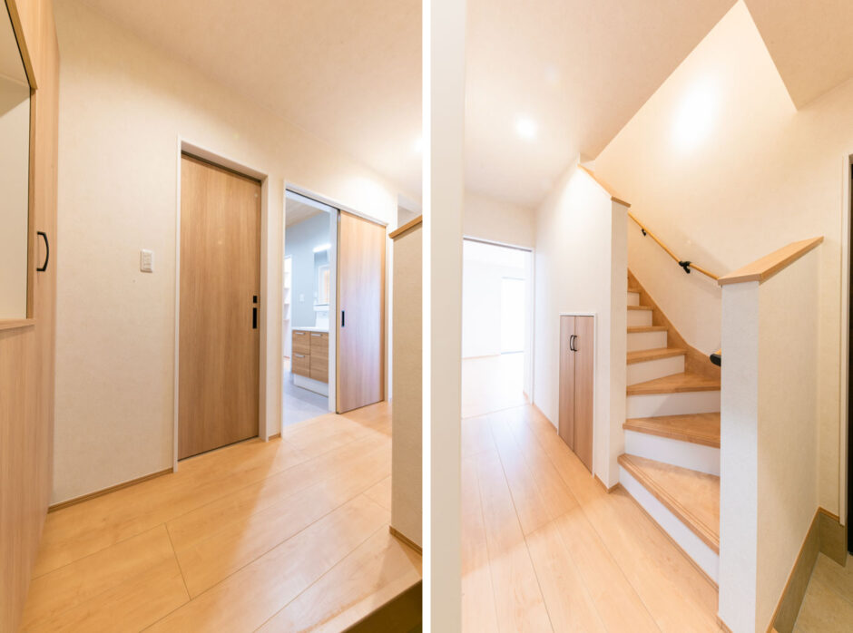 エントランスホールは、洗面室、LDK、2階へと無理なくアクセスできる配置。