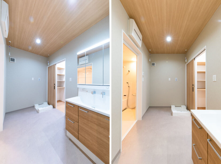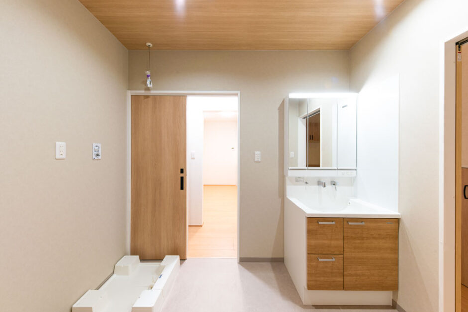 使いやすい洗面台と木目の天井で、やわらかい雰囲気に整えた洗面空間。