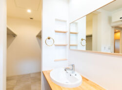 自然光が差し込み、開放感と実用性を両立した玄関ホールは、家族の日常をすっきりと迎え入れます。靴やコートをスマートにしまえるシューズインクローゼットや、奥へとつながるスムーズな動線設計もポイント。光・収納・動線、それぞれがやさしく連動する“住まいの顔”ができあがりました。