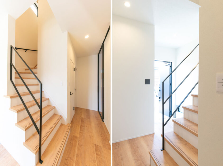 階段は圧迫感を抑えたストレート設計、ブラックのアイアン手すりが空間にほどよいアクセントを加えます。