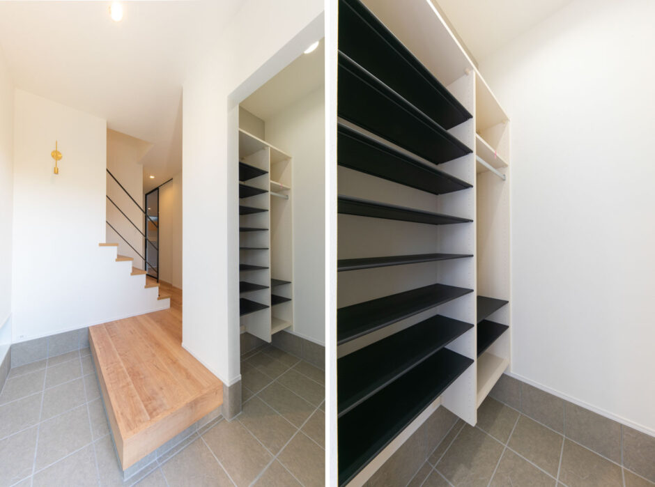 玄関にはシューズインクローゼットを設置し、靴や上着、荷物をさっと片づけられる動線に。