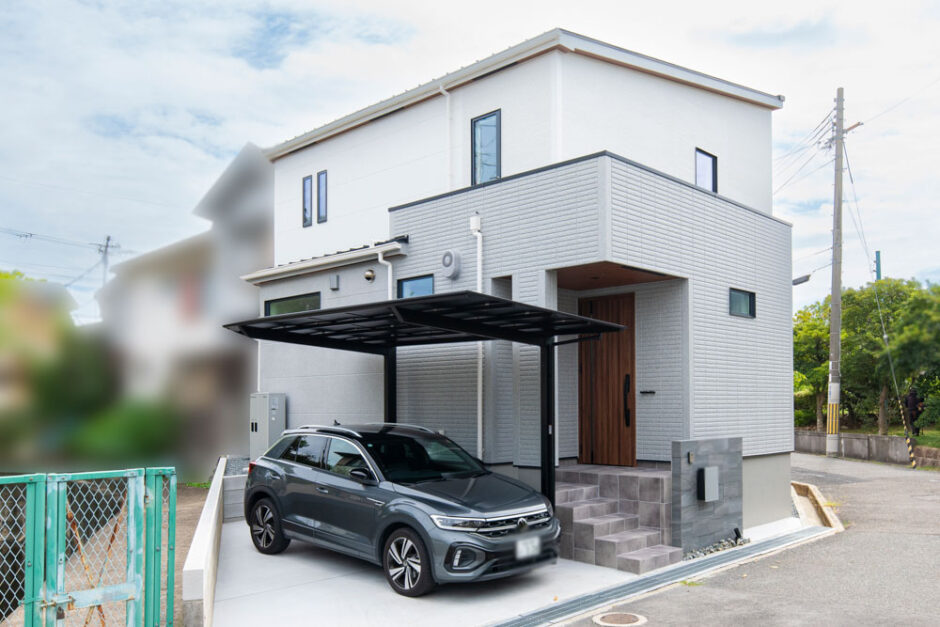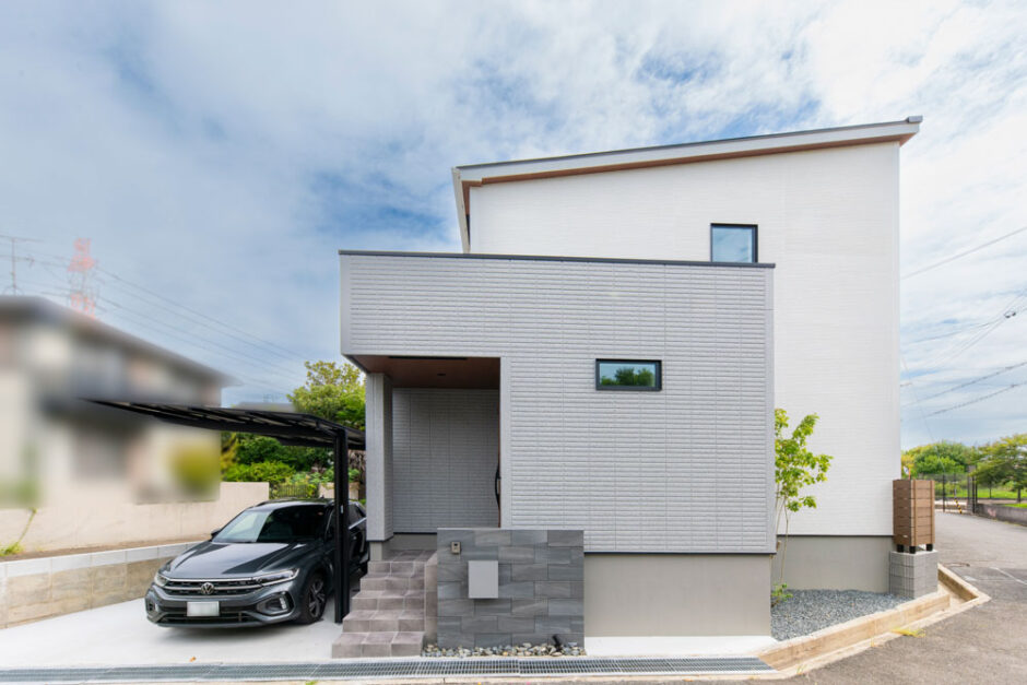 ボックス型を重ねたような立体的な構成が、外観に奥行きとリズムを生み出します。カーポートの黒がアクセントとなり、建物の印象を引き締めます。