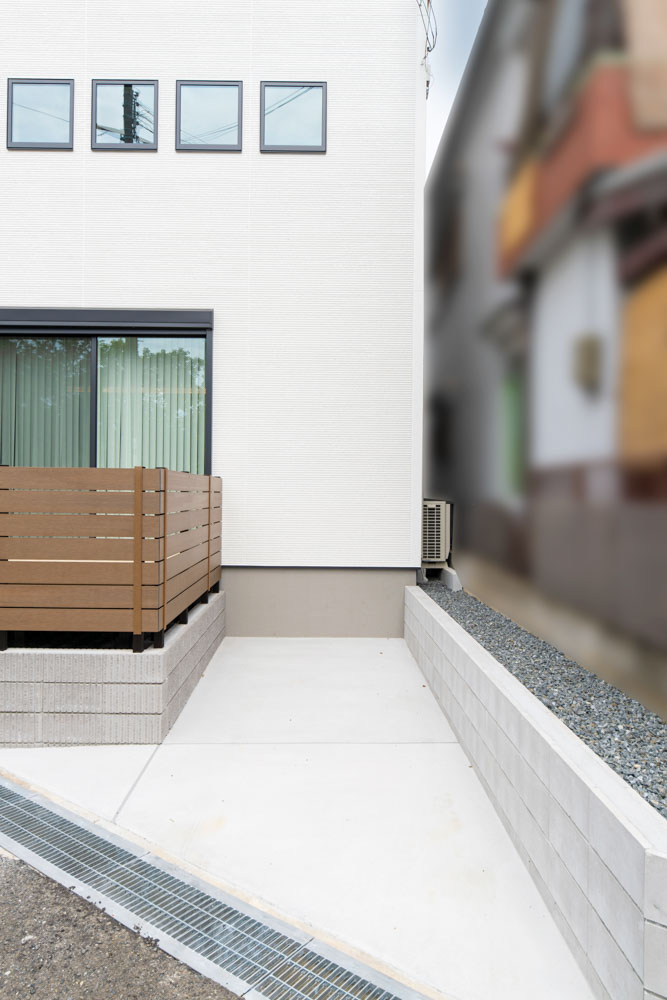 すっと伸びる軒や目隠しの設置により、光や風を通しながらも、視線にはやさしい空間に仕上がっています。立体的なフォルムと奥行き感が、静かに印象を残す一棟です。