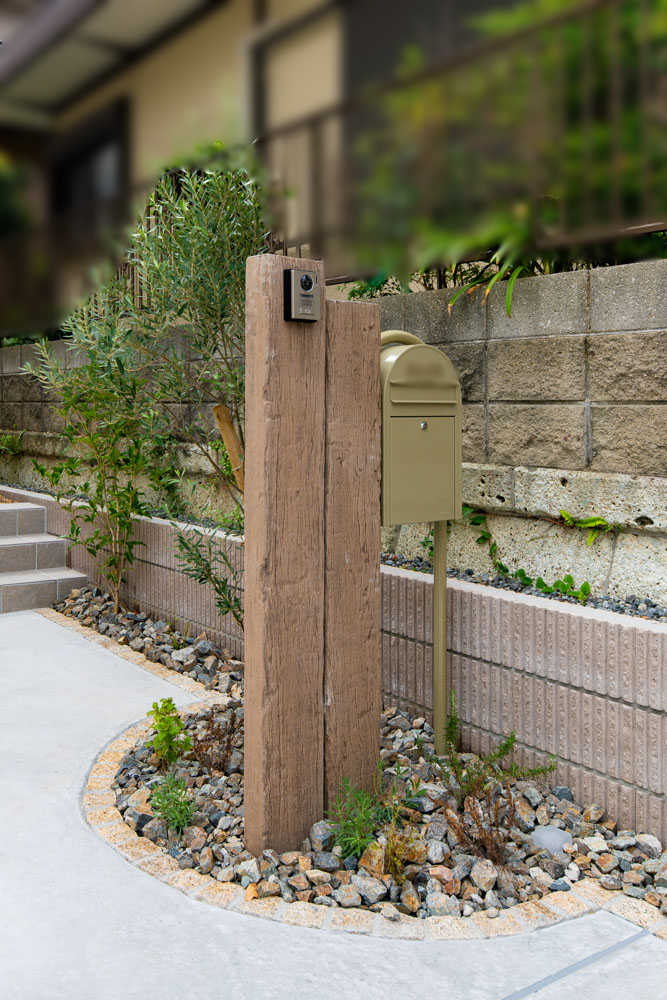 木調の門柱やグリーンのポストが外観のアクセントに。