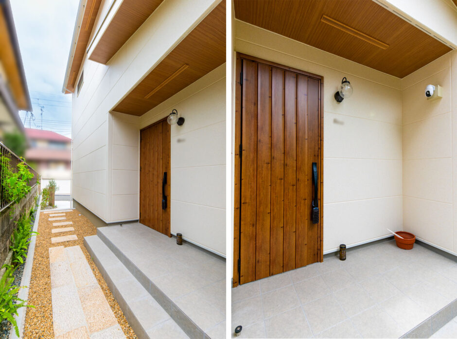 玄関はあえて道路から離れた位置に設け、プライバシーと安心感を高めています。