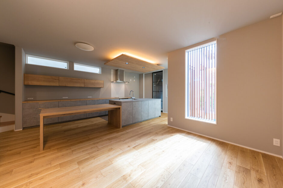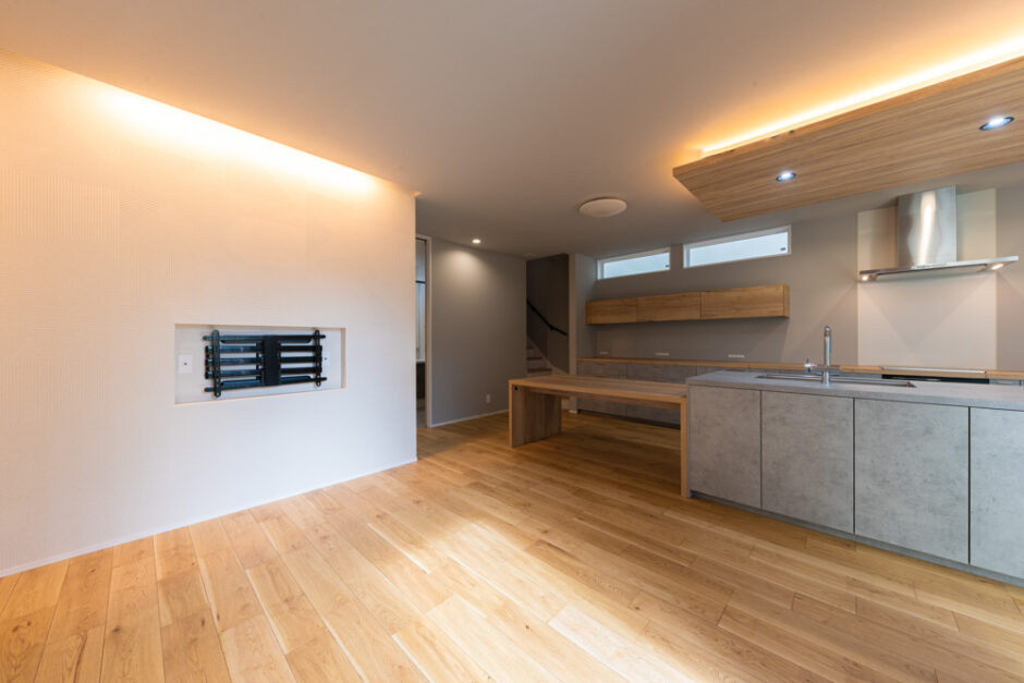 キッチンとリビングをひとつながりで配置し、 素材や光、収納の工夫によって、落ち着きと使いやすさを両立した空間をカタチにしました。