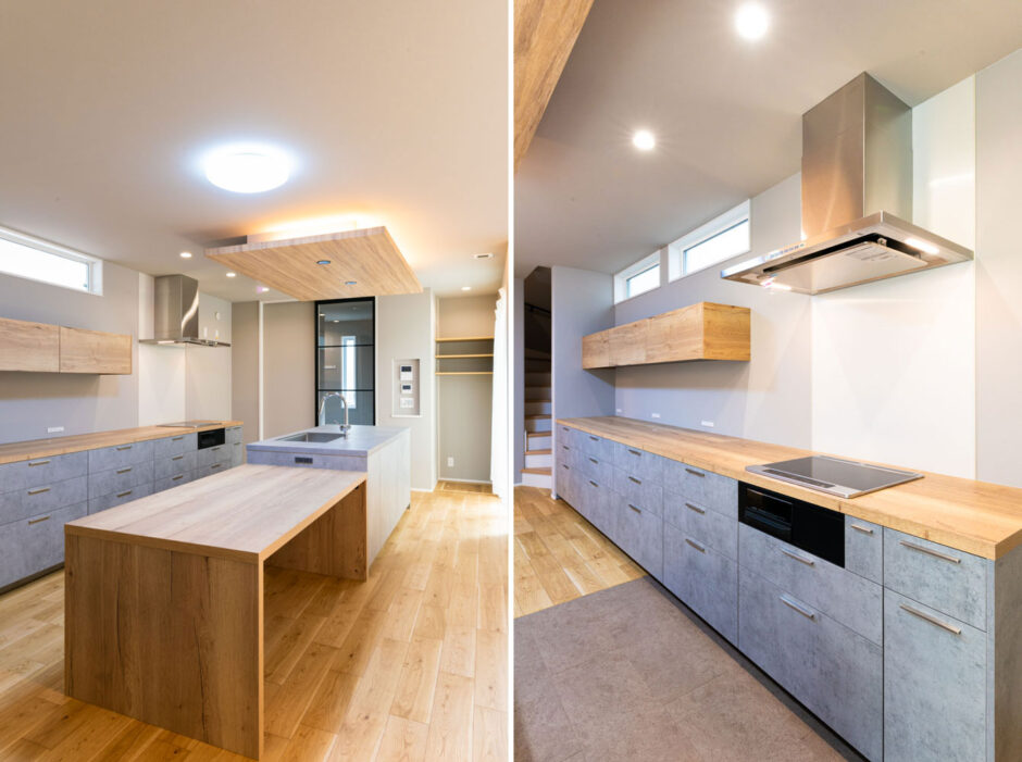 グレーを基調とした扉材と木目を組み合わせ、 LDK全体を引き締めながらも、やわらかさを感じられる佇まいに仕上げています。